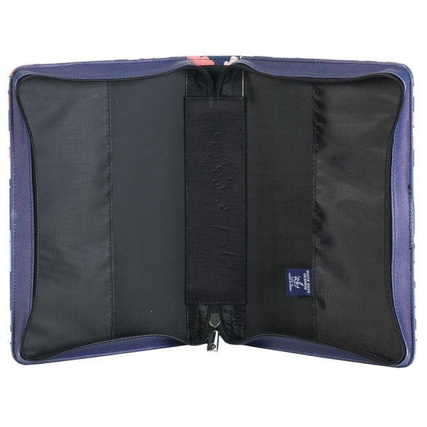 Floral Polyrethane Bible Cover with Phillippians 4:19. Non-rusting self-repairing zipper. Cut thru cross zipper pull. Side handle. Nylon reinforced stitching. Bookmark and elastic pen loop. Perfect for your bible, books OR photo albums!! White Dove Design.