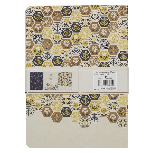 The Kind Words Are Like Honey Large Notebook Set includes three enchanting designs centered on bees, each with a distinctly different look. With three notebooks in the set, you will have more than enough space to plan spontaneous acts of kindness. Gold-foiled, yellow, blue, and white bee design, Gold-foiled lettering, Kind words are like honey, sweet to the soul, Proverbs 16:24, Be kind always, Kindness is Like Honey Collection, 3-piece notebook set, Large notebook set, Heavy-duty cardstock covers, 64 lined pages each, Wrapped in o-wrap, Set size: 8.5" x 6.2" x 0.6" (216 x 157 x 15mm) Individual notebook size: 8.5 x 6.1" x 0.15" (216 x 155 x 4mm)